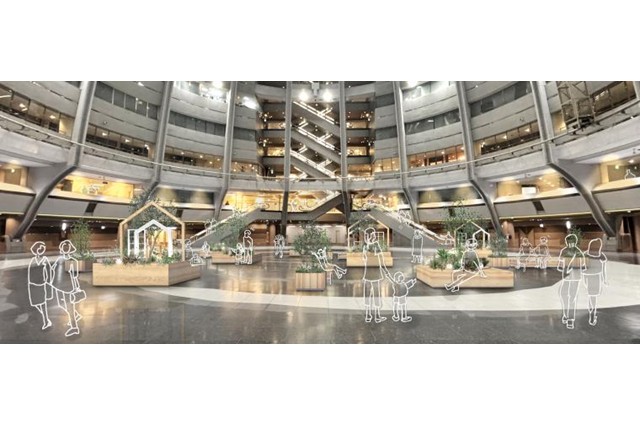 神戸ファッションマートのアトリウムプラザ(吹き抜け空間)に植栽と六甲山材を使用したベンチを設置します!