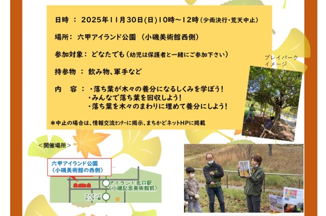 落ち葉のパワーを栄養にして、六甲アイランドの木々を元気にします。落ち葉を通して循環型社会を実感しましょう!